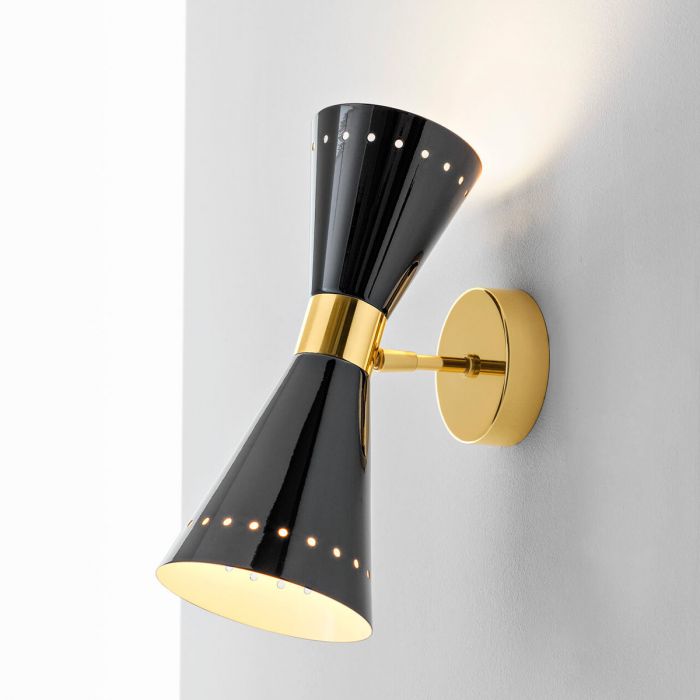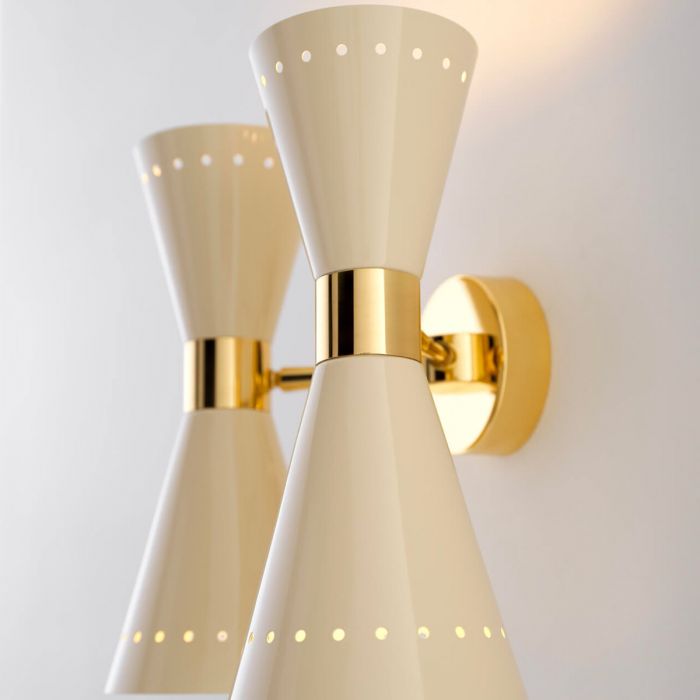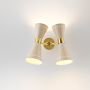 Megafono est une lampe emblématique des années 1950 avec une lumière directe et indirecte. Elle associe une précieuse structure en laiton avec dorure galvanique les abat-jour coniques en finition ivoire ou noir brillant, éclairant la pièce avec élégance.