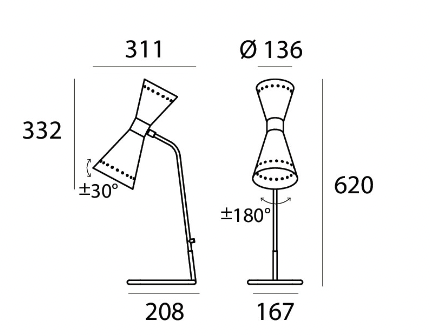 Megafono est une lampe emblématique des années 1950 avec une lumière directe et indirecte. Elle associe une précieuse structure en laiton avec dorure galvanique les abat-jour coniques en finition ivoire ou noir brillant, éclairant la pièce avec élégance.