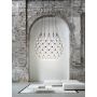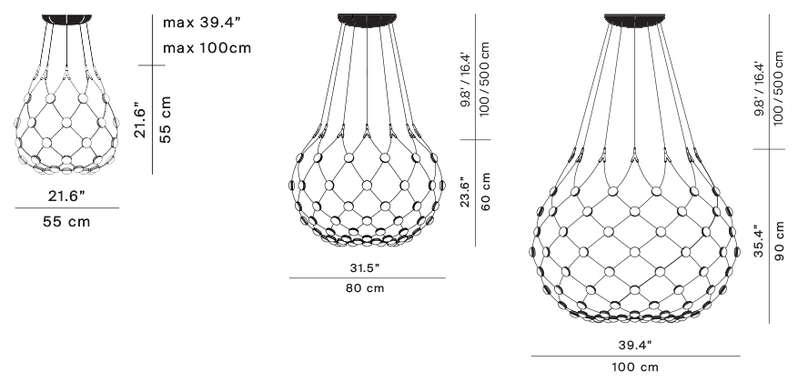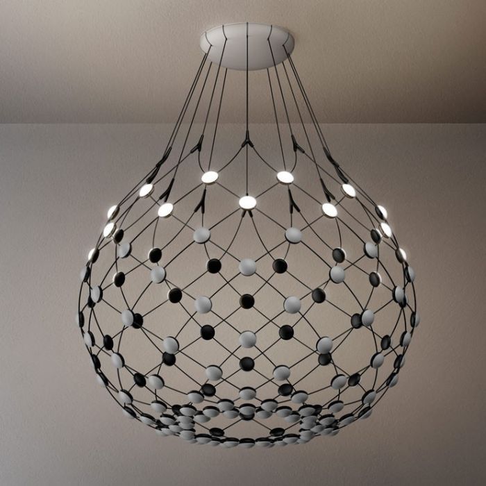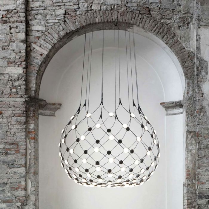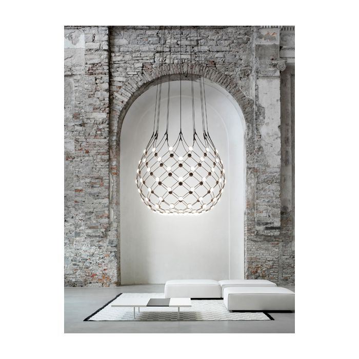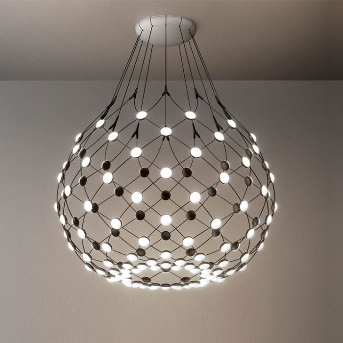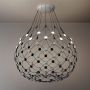 Une lampe d'un grand impact théâtral dont la structure presque transparente, composée d'un réseau de câbles flexibles avec des sources LED positionnées à leurs intersections, cache la complexité du design, le dématérialisant pour ne laisser place qu'à la lumière, véritable protagoniste.