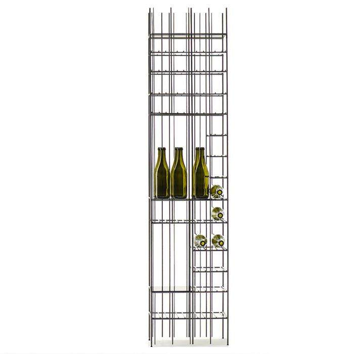 La cave Metrica est un porte-bouteilles en métal avec une structure simple dont le rythme est marqué par des tiges de fer fixées à différents intervalles à l'intérieur desquelles bouteilles et objets complètent la forme en écrivant de nouvelles compositions de temps en temps.