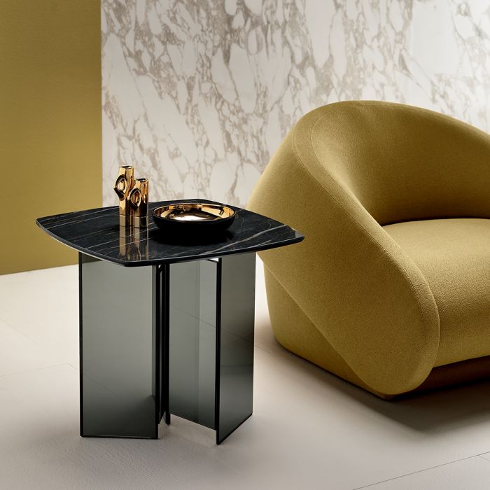 La table d’appoint ou table de chevet fait partie d’une collection de meubles caractérisée par une base en verre extra clair ou fumé. Les plateau de table sont dans les trois nouvelles finitions polies en céramique+verre effet marbre. Noir Désir, arabesque Calacatta, gris Orobico. Également disponible en version avec plateau en différentes tailles.