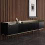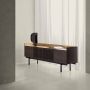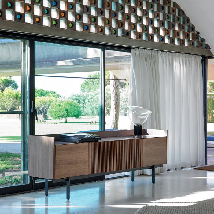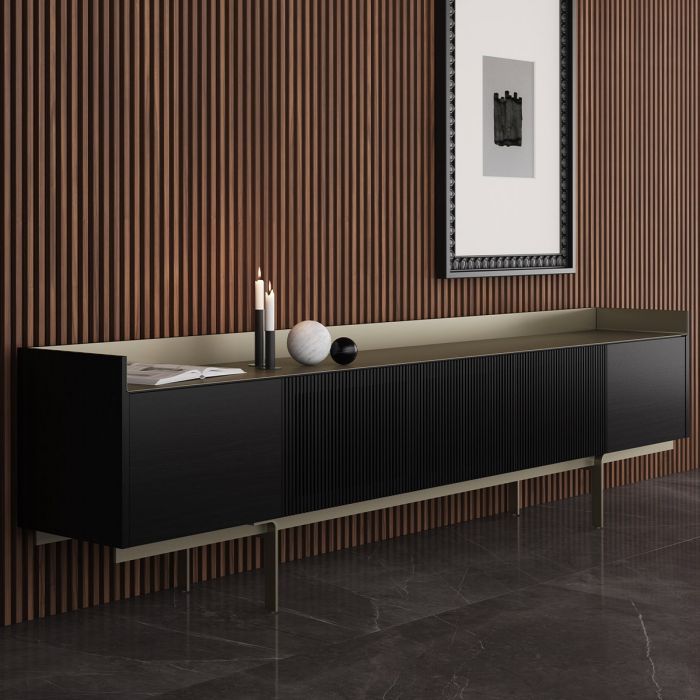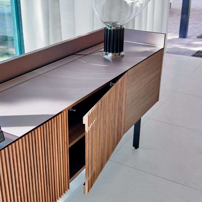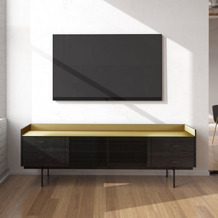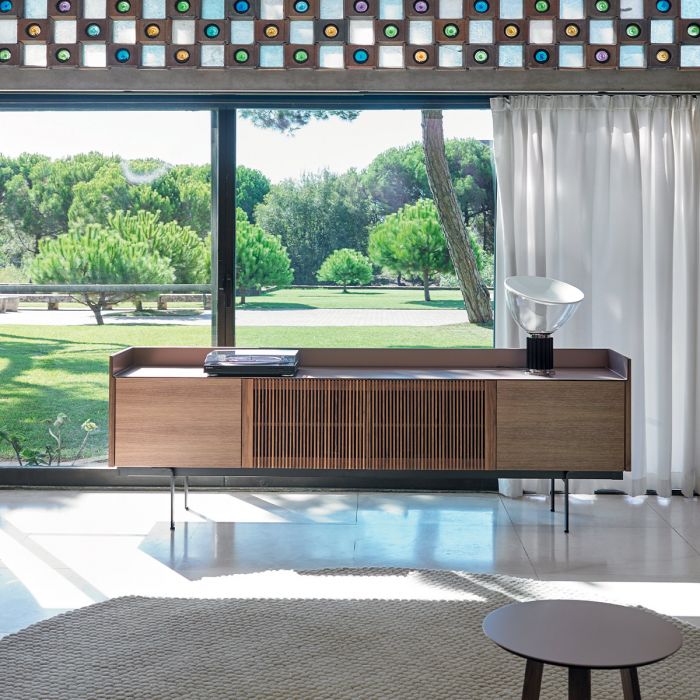 Collection de buffets, commodes, meubles de télévision et bureaux lauréats du prix Red Dot 2015 avec une finition spéciale d’aluminium en partie supérieure. Le meuble repose sur un socle, avec des pieds réglables ou avec une ferrure murale optionnelle.