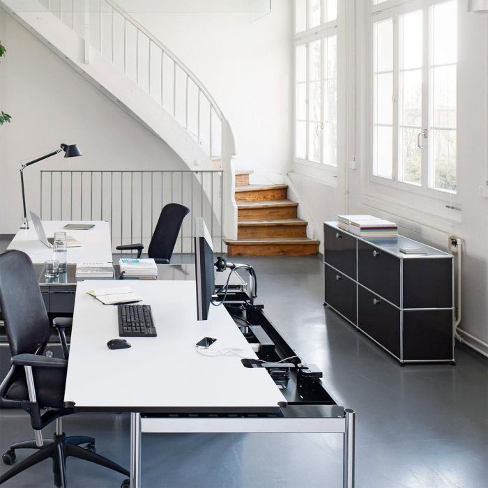 Meuble de rangement composé de 4 portes abattantes (poignées sans serrure). Créés par un architecte et un industriel visionnaires, les meubles USM sont fabriqués en Suisse depuis plus de 50 ans et reconnus dans le monde entier. Leur qualité de fabrication et leurs lignes intemporelles en font un classique incontournable du design, qui trouve sa place aussi bien dans les bureaux que dans les plus beaux intérieurs, classiques ou modernes. Leur conception modulaire permet de les faire évoluer au fil du temps selon les besoins et les envies.