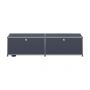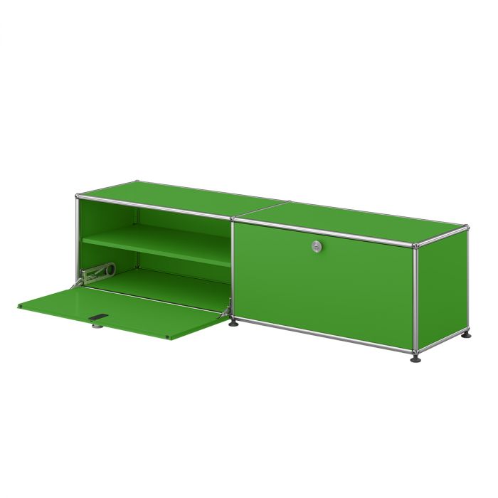 Meuble bas composé de 2 modules équipés de portes abattantes (poignées sans serrure), 1 rayon intermédiaire et 1 passage de cable. Eclairage blanc chaud à intensité variable.