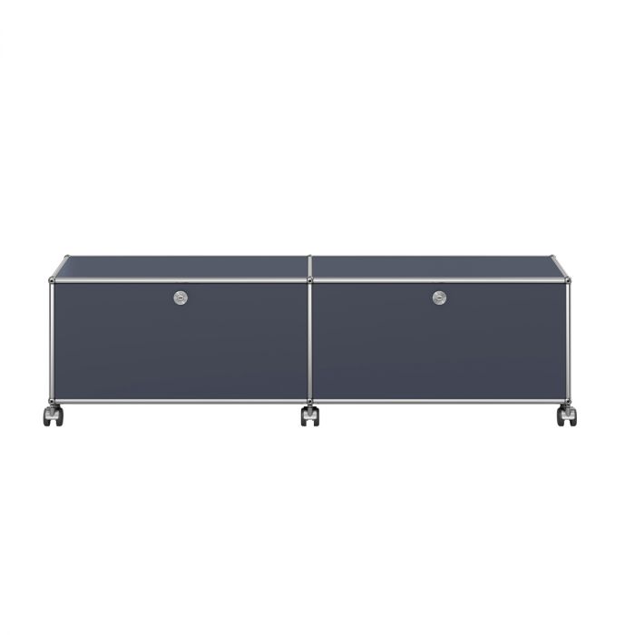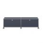 Meuble bas composé de 2 modules équipés de portes abattantes (poignées sans serrure), 1 rayon intermédiaire et 1 découpe passe-câbles.