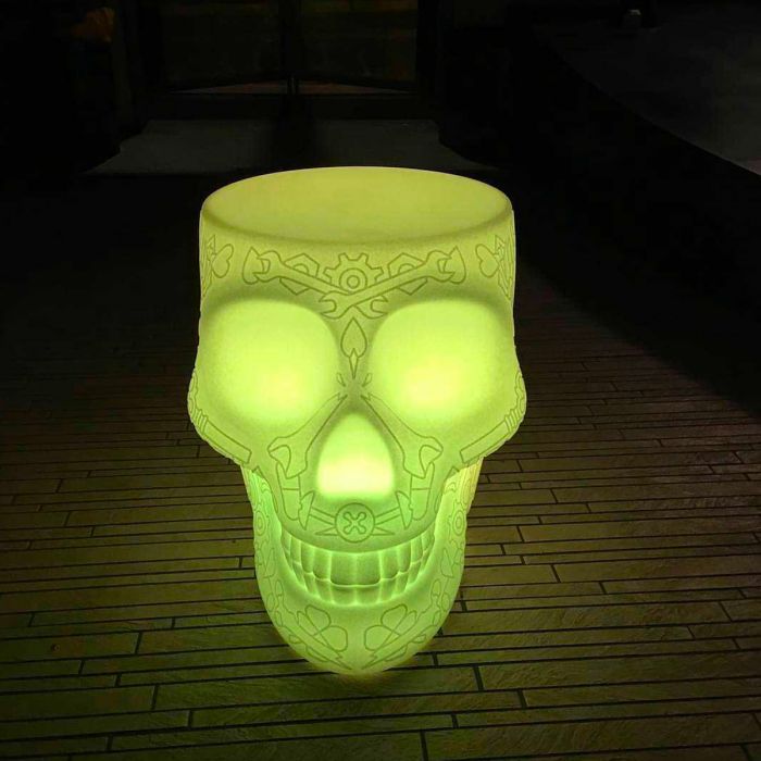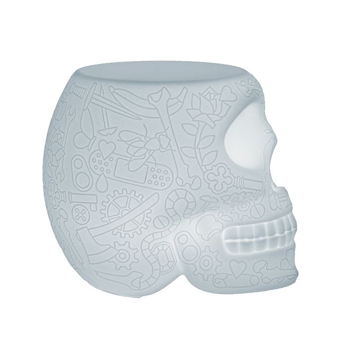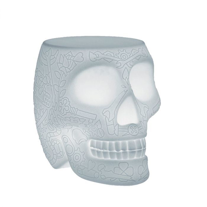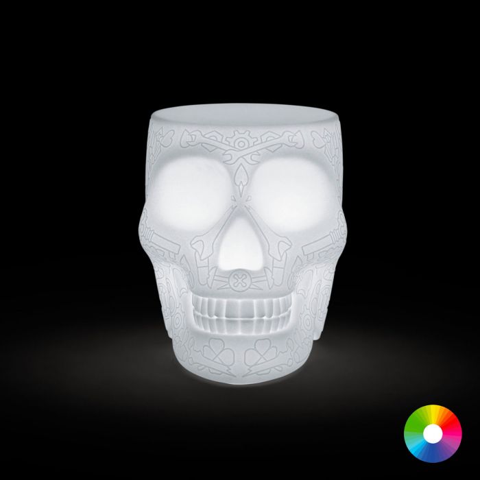 Mexico de Qeeboo par Studio Job. Mexico, conçue par Studio Job, est une lampe en forme de crâne avec un motif graphique sur la surface, fonctionnant également comme tabouret et table d'appoint. Rappelant les crânes peints traditionnels du pays du même nom, le Mexique est un rappel fantaisiste du caractère cyclique de notre présence sur Terre, pour exorciser la mort et célébrer la vie. Convient aux salons, aux salles à manger et aux espaces extérieurs. Sans fil, doté d'une batterie rechargeable, d'une lumière LED et de 16 couleurs RVB interchangeables différentes, il peut être régulé à distance par télécommande.