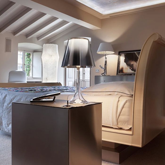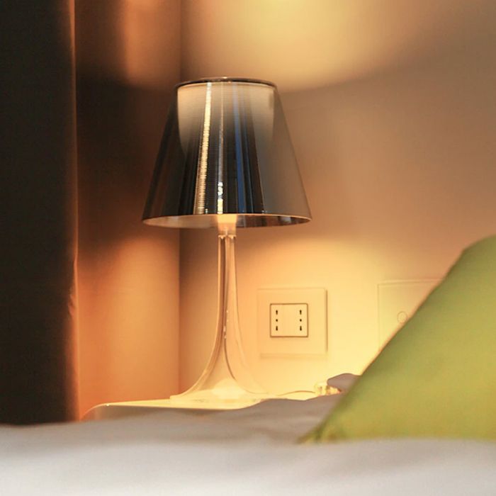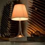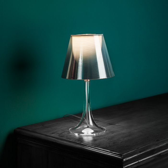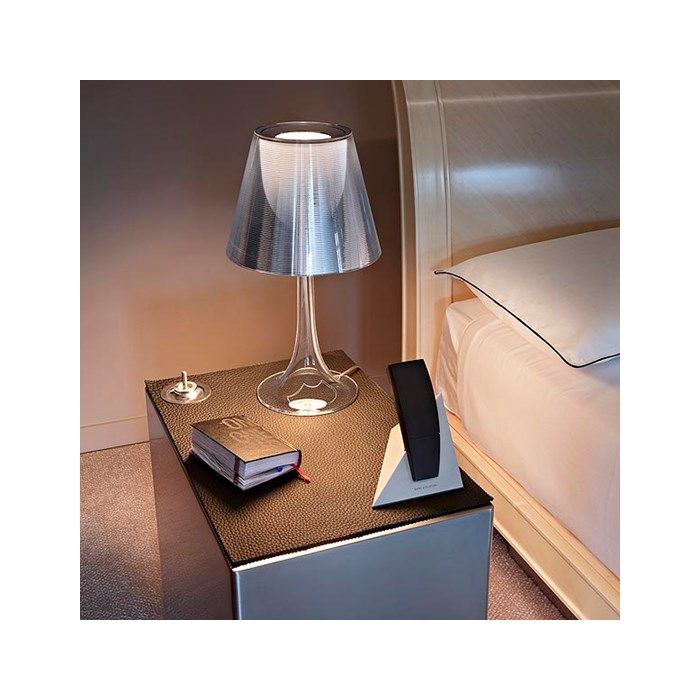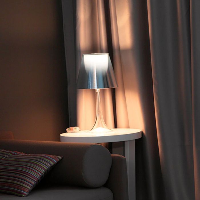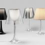 Lampe de table Miss K. de la marque Flos, réalisée par Philippe Starck. Cette lampe représente l'apologie de la classe et de la finesse. Ce mélange de courbes gracieuses, de matière derniers cris et de technologie innovante en font une lampe moderne très prisée dans l'univers du design. Elle est constituée, techniquement en PMMA (polyméthacrylate) entièrement transparent moulé par injection, d'un diffuseur interne en PC (polycarbonate) opalin moulé par injection et d'un diffuseur externe en PC (polycarbonate) moulé par injection aluminisé sur la toute surface avec un procédé d’aluminisation sous vide à l’intérieur. Lorsque Miss K est allumée, le diffuseur extérieur laisse apparaître le diffuseur intérieur qui n'était pas visible. L'apparition de ce dôme blanc donne de la clarté à la lampe. Grâce à son élégance et à sa touche de coquetterie Miss K. saura s'intégrer à merveille dans votre intérieur, bureau, salon, chambre...