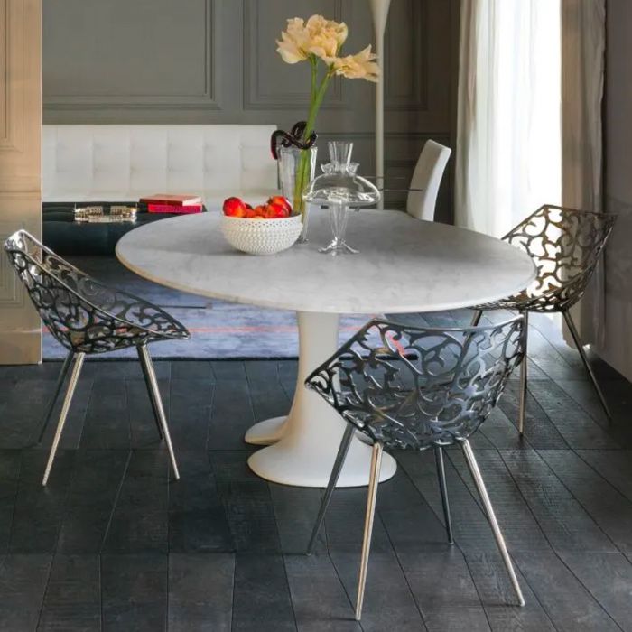 Fauteuil Miss Lacy de Driade, créé par Philippe Starck, avec coque ajouré et pieds en fusion d’acier inoxydable.