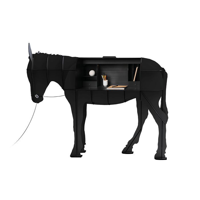 Animal emblématique du labeur tel qu’on l’entendait dans les campagnes, l’âne Maturin garde ici sa fonction tout en prenant une dimension éminemment contemporaine. Secrétaire très particulier connecté et pourvu des leds lumineuses, il est alimenté par une bride électrique. Têtu et cachottier comme ses congénères, Maturin dissimule rangements coulissants et tiroirs secrets pour la correspondance et les dossiers en attente. Après le travail, Maturin se referme à la manière des secrétaires d’antan grâce à un paravent mobile minutieusement ouvragé permettant de dissimuler l’espace fonctionnel. Animal gracieux, il ne révèle plus alors qu’un subtil jeu des raies de lumière traversant les motifs de cette paroi rétro éclairée.