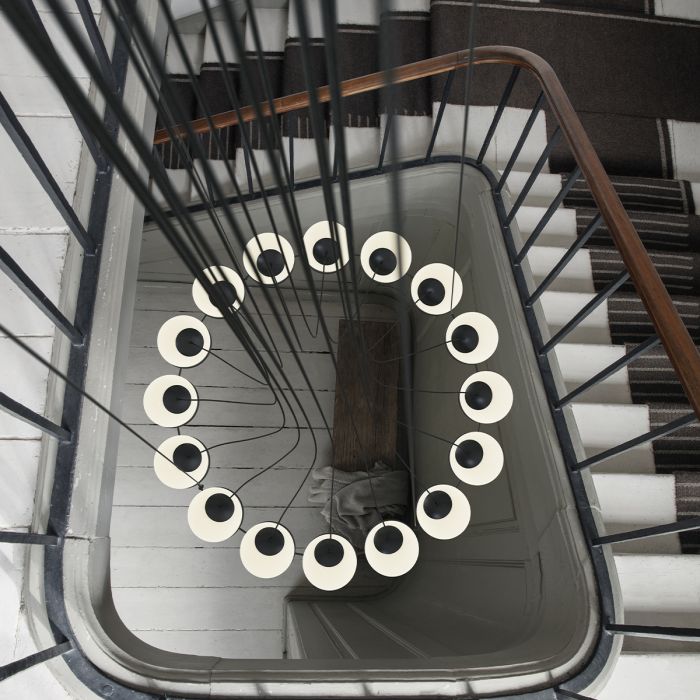 Le lustre Le Sfere est composé d'un ensemble circulaire de sphères en verre opalin soufflé. Chaque sphère est maintenue en place par une grande structure en anneau radial en acier peint en Noir ou Champagne. Les sphères peuvent être orientées vers le bas ou vers le haut pour fournir un éclairage direct ou indirect. Les modèles 2109/14/16 et 2109/14/24 comportent des sphères en verre opalin soufflé de 14 cm réparties respectivement en seize et vingt-quatre, tandis que les seize sphères du modèle 2109/20/16 sont plus grandes, mesurant 20 cm de diamètre.