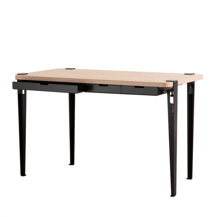 Ce bureau associe 4 pieds TIPTOE 75cm, un plateau 120x60cm en chêne et le module de rangement WAVE où viennent se loger trois tiroirs en acier. WAVE se fixe simplement au plateau grâce au serre-joint des pieds TIPTOE; en-dessous ou au-dessus du plateau.