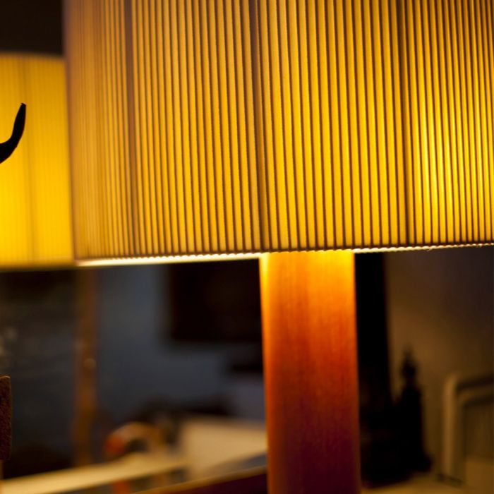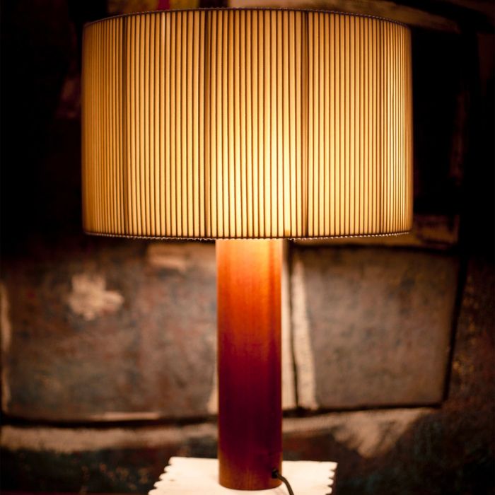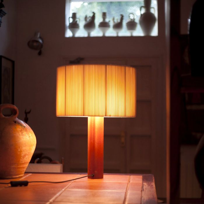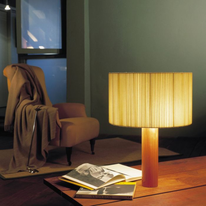 Lampe de table à l’allure sereine, pionnière d’une modernité qui exprime le tempérament pragmatique d’un grand pionnier espagnol. Un fût central de bois massif soutient un généreux abat-jour circulaire en galons de coton. Le ruban de reliure pour livres par son tissage asymétrique produit d’apaisants clairs-obscurs.