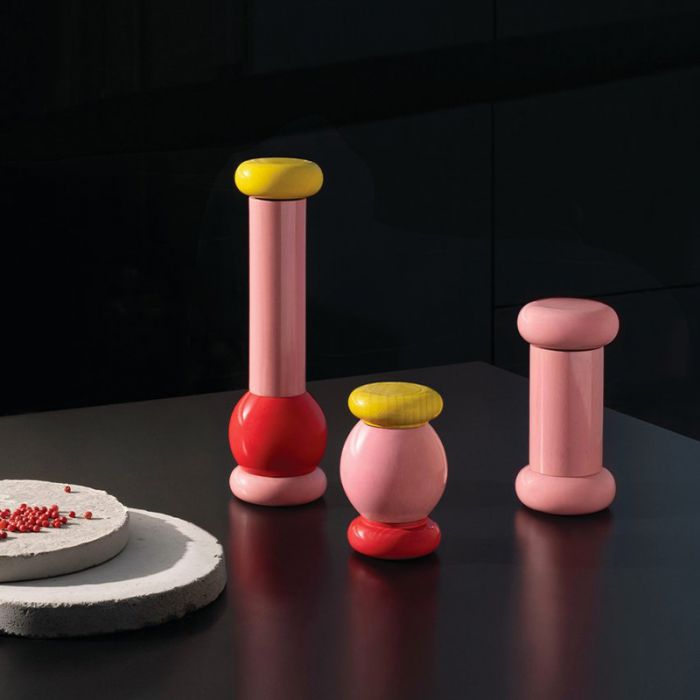 Moulin à sel de Alessi par Ettore Sottsass. Ce moulin à sel fait partie d'une collection d’objets inédites pour fêter 100 ans de recherche dans le domaine des arts appliqués et le début d’un nouveau siècle d’expérimentations. Indispensable dans toute cuisine et à table pour les repas quotidiens, ce moulin est imaginé par Ettore Sottsass, reprenant les volumes colorés superposés typiques de son style. Il est fabriqué en Italie, où Alessi a son siège, grâce à un processus de tournage en partie manuel. Les variations dans le grain, les noeuds et l’aspect du bois font de chaque moulin une pièce unique, à nulle autre pareille.