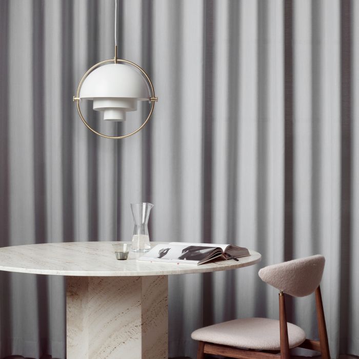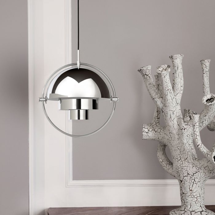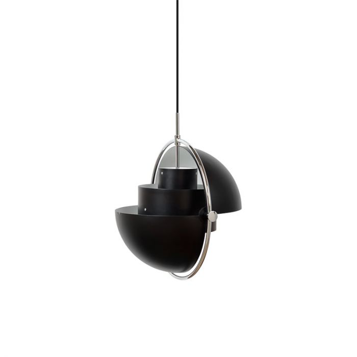 Le Multi-Lite a d'abord été dessiné en 1972 lorsque Louis Weisdorf a fait une exception à sa propre conception de l'utilisation de multiples éléments répétitifs. Il reflète plutôt sa passion pour la diversité. Deux formes cylindriques posent la base de la lampe et une bague métallique l'entoure et ancre les deux abat-jours quart-sphériques, qui finalement complètent une image d'un design iconique avec de multiples fins. La lampe suspendue Multi-Lite a une expression intemporelle qui s'adapte dans n'importe quel cadre domestique.