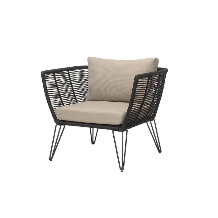 Mundo Outdoor de Bloomingville. La chaise de salon Mundo de Bloomingville est en métal noir revêtu de poudre avec une corde en polyester noir tissée à la main sur le cadre. Les housses de coussin de couleur marron clair sont en polyester et peuvent être lavées à 30 degrés. La chaise de jardin convient à tous les espaces extérieurs, mais en protégeant la chaise de la lumière directe du soleil, la couleur du tissu et la durabilité de la chaise seront prolongées. Profitez d'une chaise d'extérieur très confortable avec des coussins doux, parfaite pour les moments de détente et de convivialité. Il peut être utiliser à l'intérieur comme à l'extérieur.