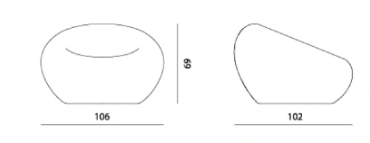 Nami de Qeeboo par Stefano Giovannoni. Le fauteuil Nami est obtenu par rotation d'une section sur un axe diagonal. Il présente une forme parfaitement circulaire où les moulures qui caractérisent sa surface se déroulent du centre vers les bords, formant une succession d'anneaux concentriques. Au centre du fauteuil se trouve le canal de reflux de l'eau. Disponible en six coloris, trois d'entre eux sont de couleur uniforme, les trois autres sont issus du recyclage et du mélange de matériaux avec deux ou trois nuances différentes.
