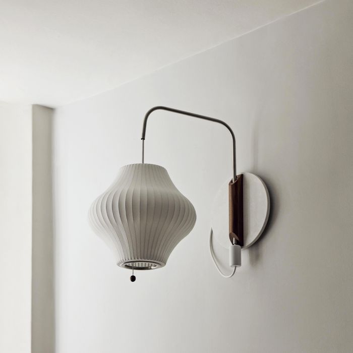 Faisant partie de la série Nelson Bubble Lamp, l'applique murale Nelson Pear a une forme qui s'évase au centre. Un support mural en noyer et un bras en acier fixent l'abat-jour sphérique allongé à un mur, remplissant n'importe quel intérieur d'une lumière chaude et diffuse. Le bras peut être ajusté de gauche à droite et de haut en bas, sans avoir à changer sa position sur le mur.