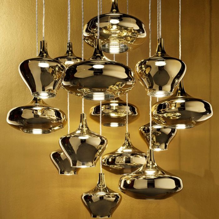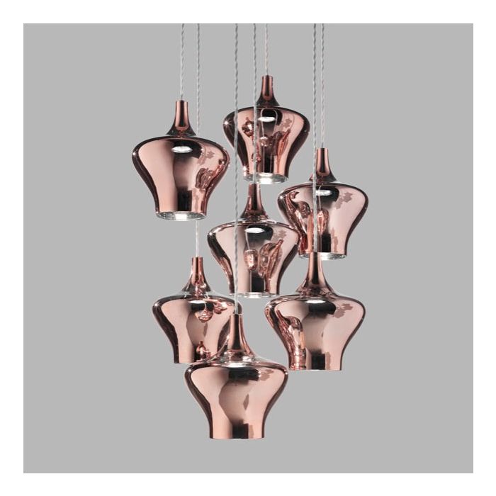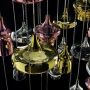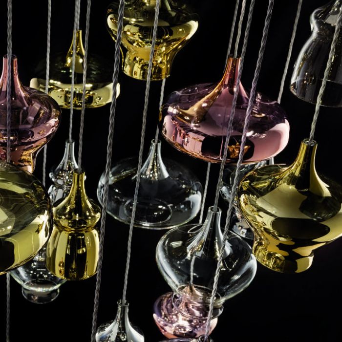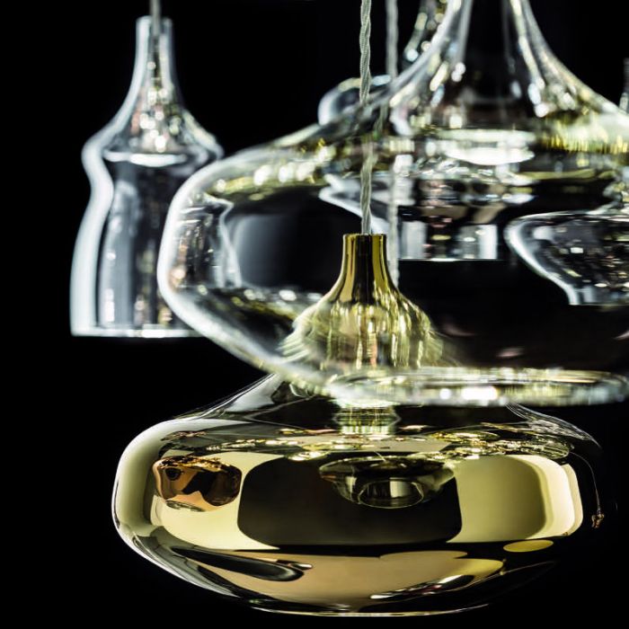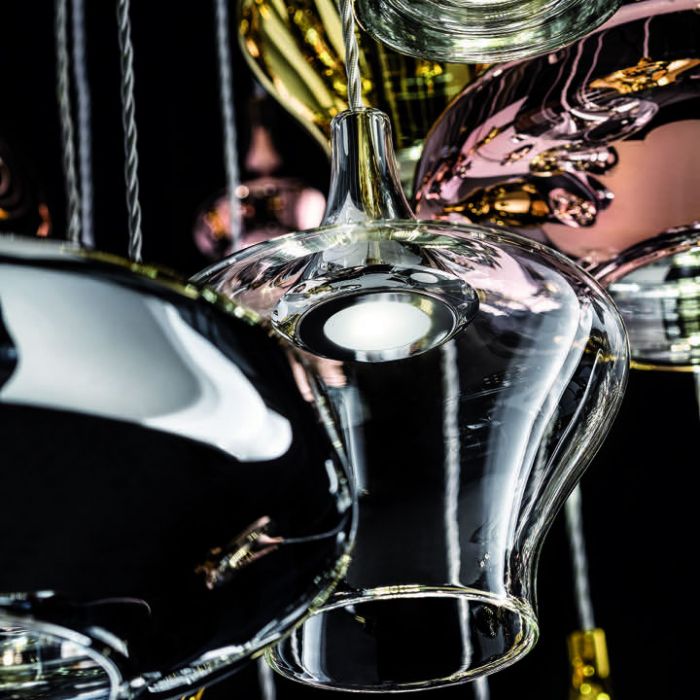 Une forme rétro qui se fond avec des lignes modernes. L'expertise de la production de verre soufflé et la technologie la plus avancée permettent des compositions amples et équilibrées pour éclairer quoi que ce soit à partir d'une table pour l'atrium d'un hôtel avec des finitions précieuses luxueuses à couper le souffle.