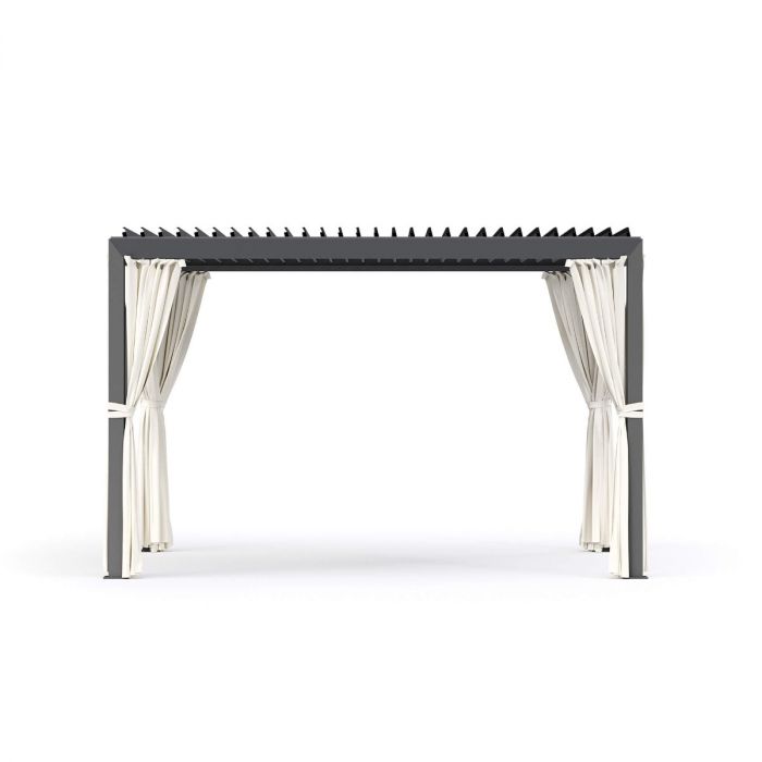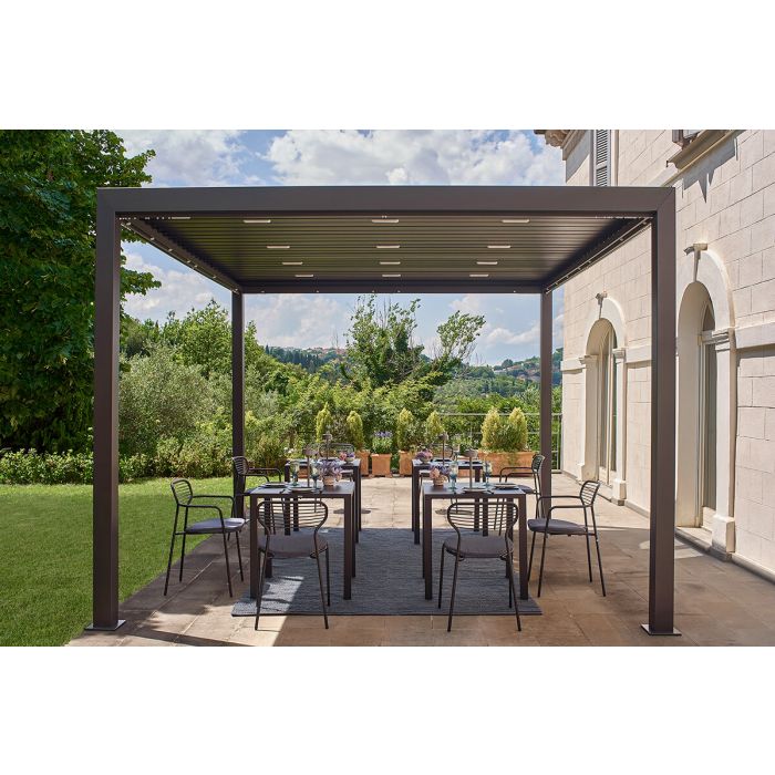 Nuvola, design EMU D&S Lab, est un système de couverture au design linéaire et transversal qui définit, meuble et protège les espaces extérieurs résidentiels et contract. Les lames orientables et réglables selon les besoins et le système d'éclairage led intégrable rendent cette collection parfaite pour toute utilisation à tout moment de la journée. En outre, les rideaux disponibles en tant qu'accessoires peuvent être ouverts et reliés entre eux pour un ombrage et une intimité complets ou recueillis autour des tiges latérales pour une esthétique plus définie.