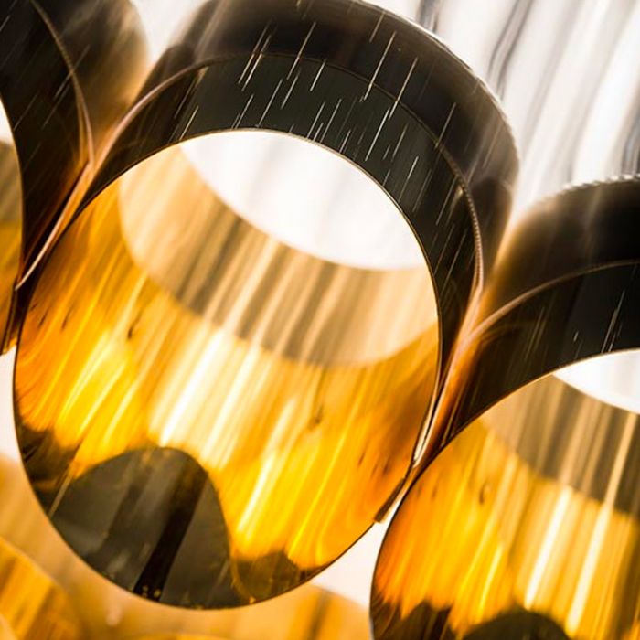 Du grec Ωδείον – «bâtiment destiné aux performances musicales» – le plafonnier scénographique conçu par l’artiste Lorenza Bozzoli, rappelle les gloires de l’Art Déco et son architecture opulente en fort contraste avec l’austérité du premier après-guerre. Ode à la beauté, au théâtre, aux arts vivants et à la joie de vivre, la collection Odéon est articulées en corolles concentriques de cylindres constituées de l’accouplement de Goldflex ® – technopolymère métallisé – Lentiflex ® – technopolymère à effet vitreux et nervuré.