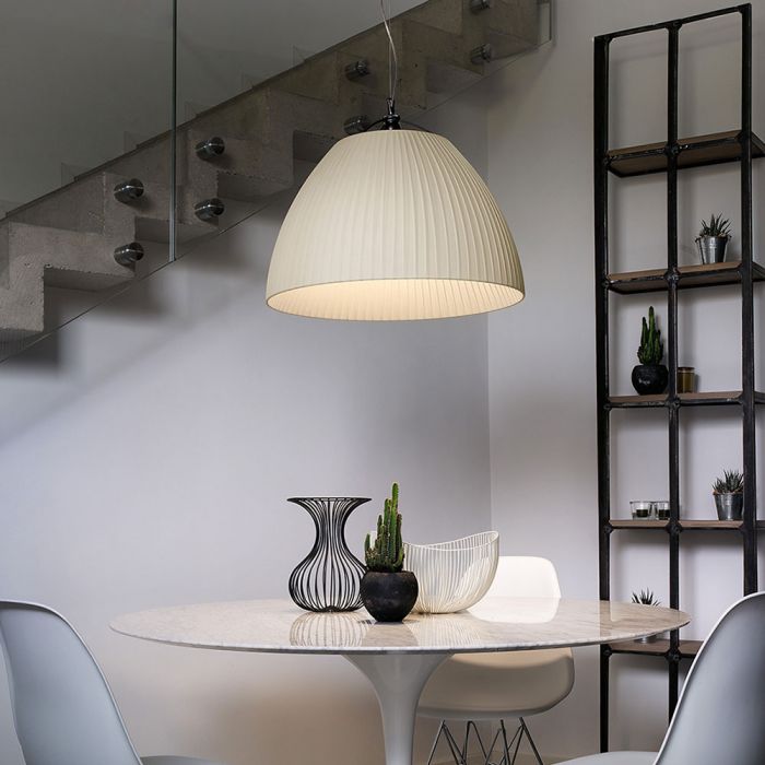 Féminine et malicieuse, Olivia séduit par sa silhouette moelleuse et par son pouvoir magnétique de la lumière. Associé à la nition en plissé classique ou à godron, un support rigide moulé en polyméthacrylate ou en polycarbonate translucide exalte les lignes généreuses de la lampe et évite les ombres que crée inévitablement un châssis métallique. Suspension ou plafonnier, Olivia existe en deux tailles et s’habille en tissu plissé monocolore ou bicolore: un style délicat qui revêt de grâce les espaces intérieurs.