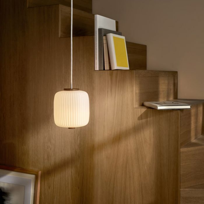 Conçue en 1961 mais jamais mise en production avant aujourd'hui, la suspension Opal EK61 est désormais lancée en verre et en bois. Conçue par le fils du célèbre designer danois Kaare Klint, la suspension sobre et élégante d'Esben Klint a été imaginée à l'origine en plastique plissé. Trop compliquée à produire à l'époque, la conception est restée dans les archives familiales jusqu'à présent. L'itération moderne est réalisée dans une forme elliptique plissée en verre opale soufflé à la bouche. Les détails distinctifs en chêne rappelant les lanternes chinoises traditionnelles sont méticuleusement tournés et affinés à la main pour une expression classique. Disponible en trois tailles, l'EK61 émet une lumière douce et indirecte grâce à sa combinaison minutieuse de matériaux classiques.