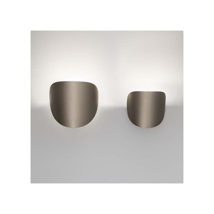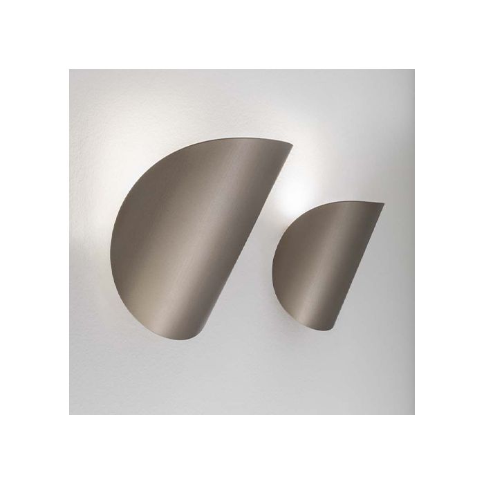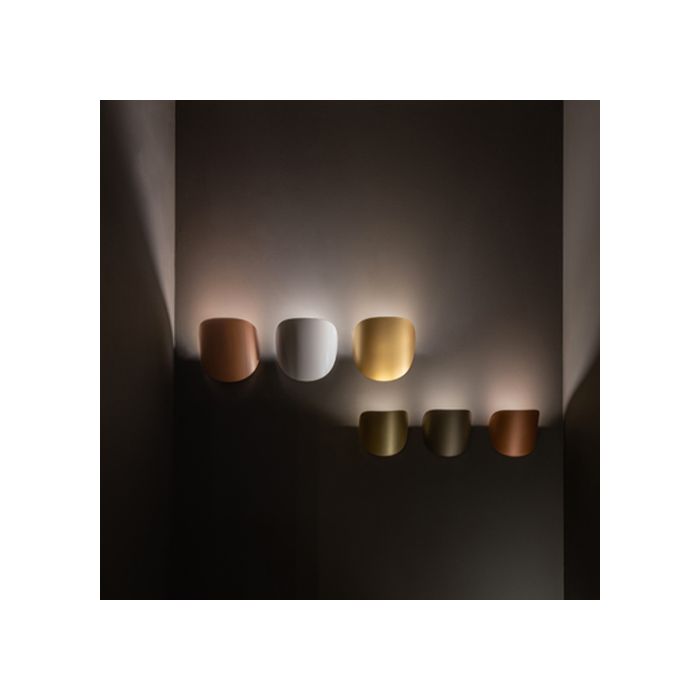 Applique au design simple mais élégant. La forme circulaire, légèrement incurvée, enveloppe la source lumineuse lui permettant de s'étendre dans l'espace : une géométrie rehaussée par des finitions en métal précieux.