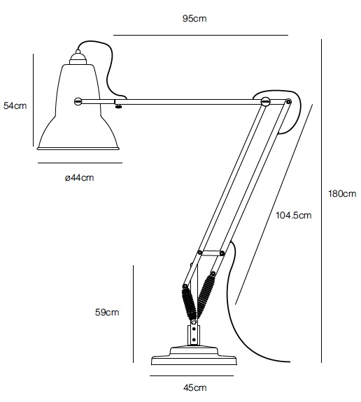 La lampe Giant 1227 est une lampe mythique de Anglepoise. Imposante pas sa taille (2m70), elle est la réplique géante de la traditionnelle lampe d'architecte. Elle est composée d'une base et d'une fourche en acier. Son abat-jour, son bras et ses joints sont en aluminium. Giant est équipé d'un variateur d'intensité lumineuse. Grâce à se quatre roulettes, il se déplace très facilement (peut être bloqué en position de sécurité). Elle a été conçue selon le principe des mouvements du bras humain avec ses trois tiges tenues en position par un ressort qui peut s'étirer dans toutes les directions. La lampe Giant est une icône design qui reflète l'esprit industriel. Son design typique des années 30 a un côté très classique qui contraste de façon surprenante avec la modernité des dimensions XXL.