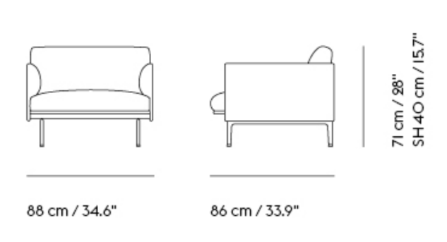 Outline est un exemple rare de fauteuil lounge élégant. Contrairement à son volume spacieux, Outline laisse apparaitre sa délicatesse et sa sofistication. Ceci est du à un design simple et bien considéré du début à la fin, une sturcture pointue, des accoudoirs fins et des coussins effilés maximisant l'espace disponible pour l'assise. Les pieds discrets du fauteuil sont nichés sous la base, donnant un effet de survol au fauteuil, une apparance quasi légère, ce qui va compléter, plutôt que dominer, un espace intérieur.