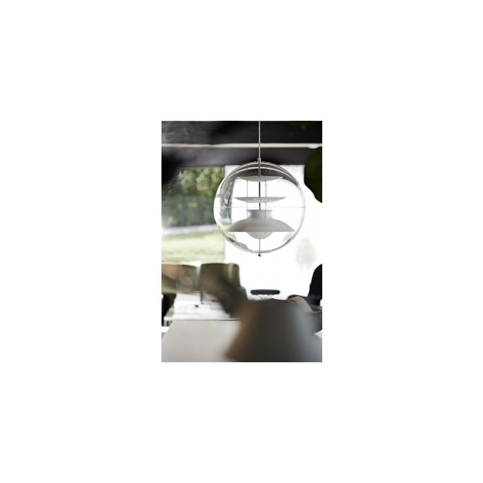 Acrylique transparent. réflecteur blanc interne. Suspendu par trois chaînes d'acier.