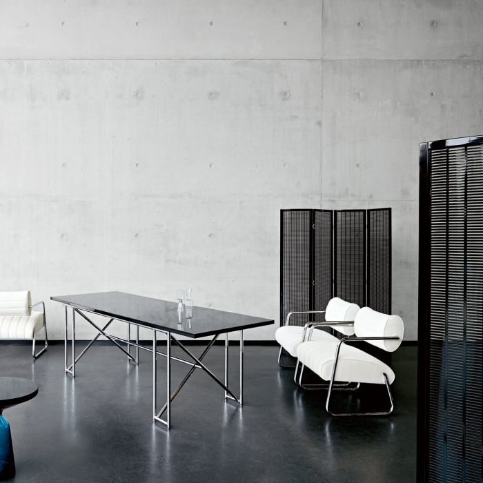 Le look high-tech qui a émergé dans les années 80 et qui est toujours d’actualité latente avait un précurseur ingénieux : il y a plus d’un demi-siècle, Eileen Gray a anticipé l’esthétique industrielle cool de la technologie moderne avec le paravent et sa lampe fluorescente Tube Light.