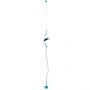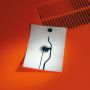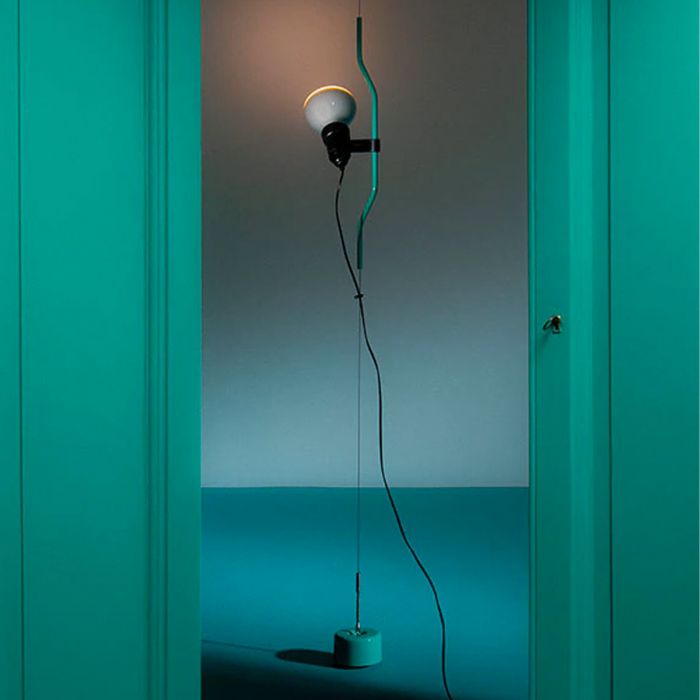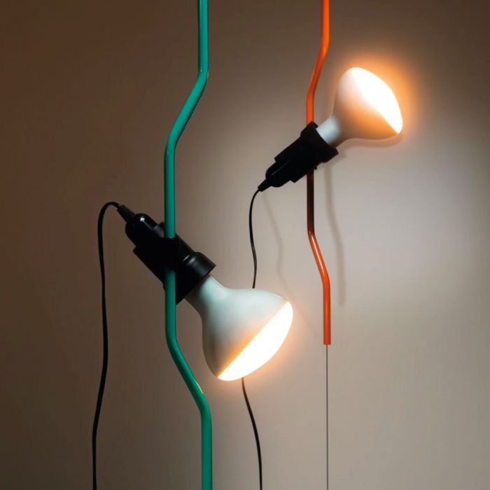 Lampe ajustable à lumière directe. La lampe se déplace verticalement en faisant coulisser un tube en acier peint le long d’un câble en acier tendu entre le plafond et le sol (4 000 mm de long). La tête de la lampe, en élastomère noir moulé par injection, abrite l’interrupteur. Contrepoids en fonte recouvert d’une gaine en silicone de la même couleur que le corps de la lampe. Un variateur électronique est présent sur le câble afin de régler l’intensité de l’éclairage.