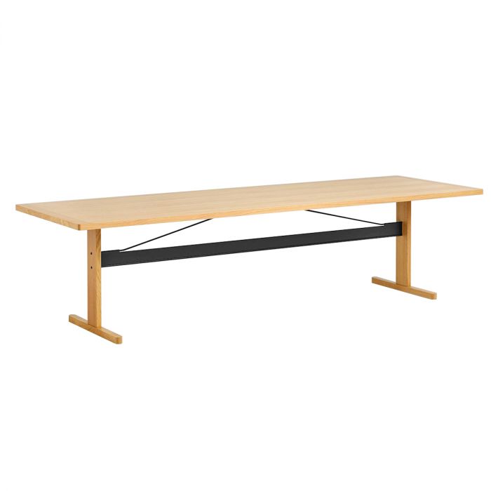 Passerelle Table L260cm de Hay. Inspirés par l'esthétique épurée des meubles Shaker classiques, les designers français Ronan et Erwan Bouroullec ont conçu la table Passerelle - une interprétation mise à jour partageant la même simplicité et la même qualité dans un contexte plus contemporain. Avec une construction bien équilibrée et emballée à plat, le plateau de table présente des bords en bois massif et une surface supérieure en placage, stratifié ou linoléum, avec le noyau en Lisocore® - un matériau avancé de haute qualité qui offre une grande résistance tout en étant extrêmement léger et facile à déplacer. La sous-construction est tout aussi robuste et fonctionnelle, avec un cadre en bois massif et une barre transversale en aluminium et en acier qui renforce et stabilise la table. La variété d'options de matériaux, de couleurs et de tailles de la table Passerelle amplifie sa qualité multifonctionnelle, la rendant également appropriée pour une utilisation comme cuisine, table à manger ou table de réunion dans les espaces privés et publics.