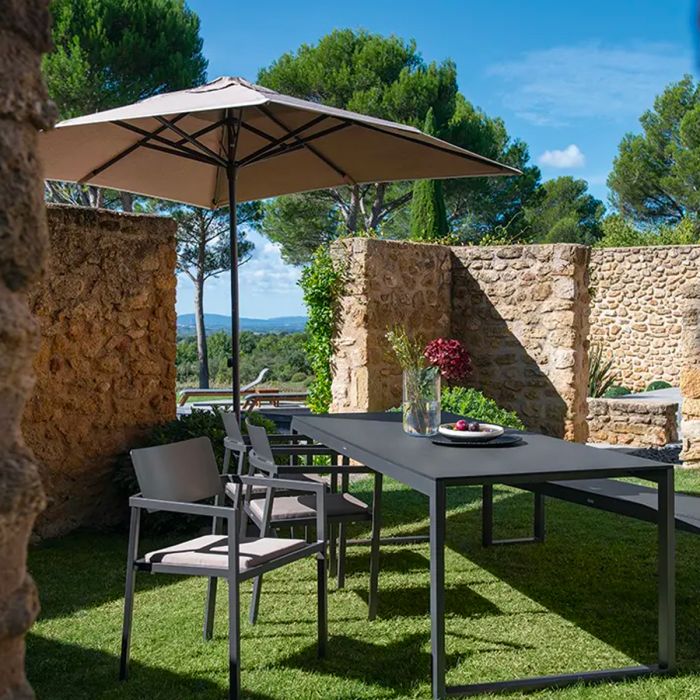 Matériaux : Aluminium, toile teint masse 100% Acrylique, mousse polyuréthane haute résilience de densité : 30 kg/m³