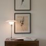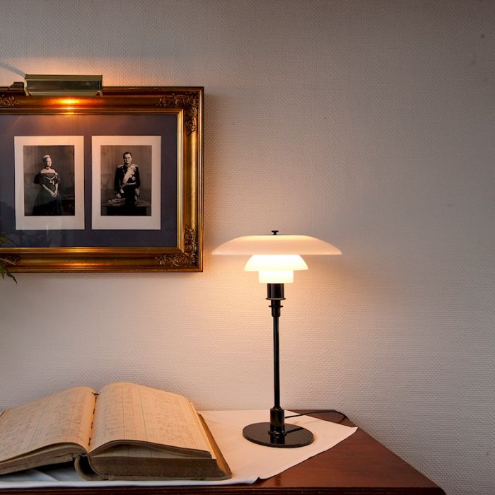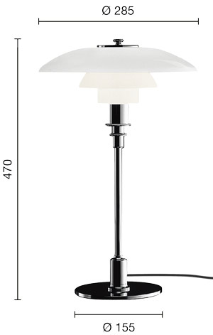 La lampe de table PH 3/2 fait partie de la famille PH 3-abat-jour, et le principe du luminaire PH 3-abat-jour a été réalisé durant les quelques mois mouvementés de l’hiver 1925-26 pour une grande halle d’exposition à Copenhague, au Danemark, appelée « Forum ». Les luminaires PH sont conçus comme un système d’éclairage rationnel dans lequel la taille de l’abat-jour, son matériau et ses surfaces pouvaient être combinées mutuellement en fonction de la nature du projet. Les abat-jours de la lampe de table PH 3/2 sont composés de trois couches de verre opalisé soufflé, poli à l'extérieur et sablé à l'intérieur, qui émettent une lumière douce et diffuse, le pied du luminaire et la colonne sont en laiton chromé à finition brillant. Ce luminaire est réfléchi par plusieurs réflecteurs et n'éblouit pas. La forme des réflecteurs repose sur une spirale logarithmique au centre de laquelle est placée une ampoule.