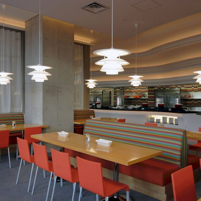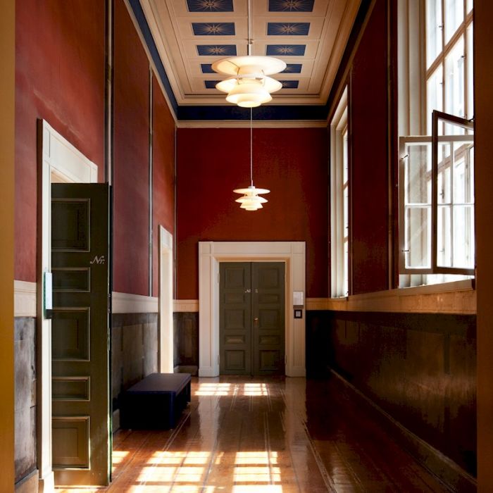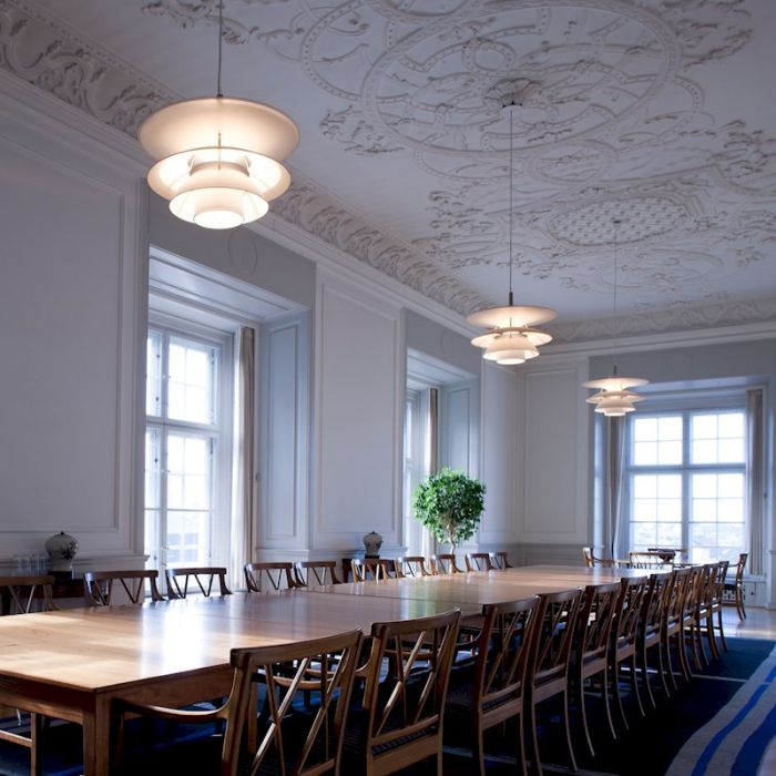 PH 5-4½ diffuse une lumière homogène et agréable. Ce luminaire à 4 abat-jour est conçu pour fournir plus de lumière aux murs, que celui à 3 abat-jour. L'abat-jour supérieur en trompette éclaire la zone située au-dessus des trois abat-jours qui dirigent principalement la lumière vers le bas. Un réflecteur situé à la base et un anneau bleu éliminent tout risque d'éblouissement, quel que soit l'angle. La lumière la plus forte se trouve directement en dessous du luminaire. Les abat-jours possèdent une finition en peinture blanche afin de créer une lumière aussi confortable que possible.