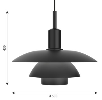 La lampe produit une lumière anti-éblouissante diffuse et agréable, typique de l’ensemble abat-jour réfléchissant de Poul Henningsen. Cette lampe est disponible en verre opalisé blanc, ou en métal peint noir finition soft touch et face interne blanche. Alors que les abat-jour métalliques à la face interne peinte en blanc renvoient une belle lumière essentiellement dirigée vers le bas, les abat-jour métalliques supérieurs associés aux abat-jour inférieurs translucides en verre soufflé à trois couches génèrent une lueur chaleureuse autour de la suspension. Le diffuseur fourni en verre dépoli est très simple à insérer et permet d’adoucir encore plus la répartition de la lumière.