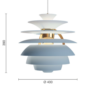 Ph Snowball de Louis Poulsen par Poul Henningsen. Le PH Snowball est considéré comme une version réduit du PH Louvre réalisé pour l’église adventiste de Skodsborg, au Danemark. À la différence du PH Louvre, le nombre d’abat-jour est réduit à huit, montés sur trois tiges, et le diamètre du luminaire est également réduit en raison du fait qu’il a été prévu pour des espaces à plafond plus bas. Ce luminaire a été présenté pour la première fois avec le PH 5 et le PH Pomme de pin, mais il n’a pas reçu la même attention que les deux autres suspensions. Toutefois, un nouveau dessin et une réintroduction du PH Snowball en 1983 a permis de faire revivre ce luminaire. Aujourd’hui, il est réalisé avec des abat-jour blancs ayant une partie supérieure brillante et une partie inférieure matte. Le dessus des abat-jour est brillant pour créer une lumière étincelante. La partie inférieure est matte pour éviter les réflexions de la source lumineuse. Le nouveau PH Snowball en Soft White(blanc doux) présente une finition légèrement mate avec un niveau de brillance 40 à l’extérieur et un cadre en laiton métallisé poli ou en chrome brillant. En revanche, la version existante en White a un niveau de brillance 95 à l’extérieur et un cadre chromé.