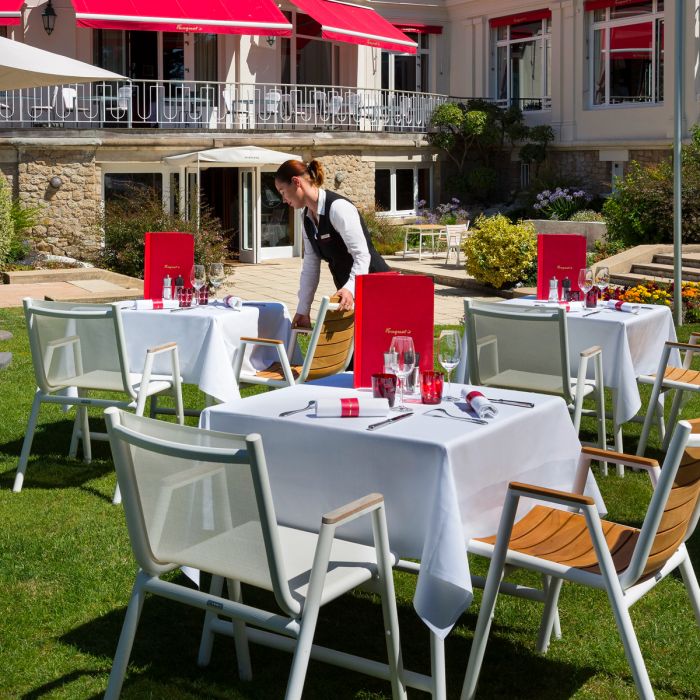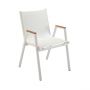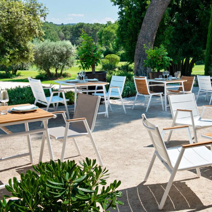Pilotis de Vlaemynck. Né de l'imagination des designers italiens Natalia Rota Nodari et Alberto Basaglia, le fauteuil Batyline® et aluminium Pilotis propose un mariage de matières harmonieux. Un fauteuil de terrasse et de restaurant qui séduit par son allure intemporelle ! Inspiré des ponts de bateau, le fauteuil Batyline® tissu et aluminium Pilotis se compose d'une structure tube aluminium rehaussée par une assise et un dossier en tissu outdoor doux et confortable, et des accoudoirs en aluminium à incrustation teck massif.
