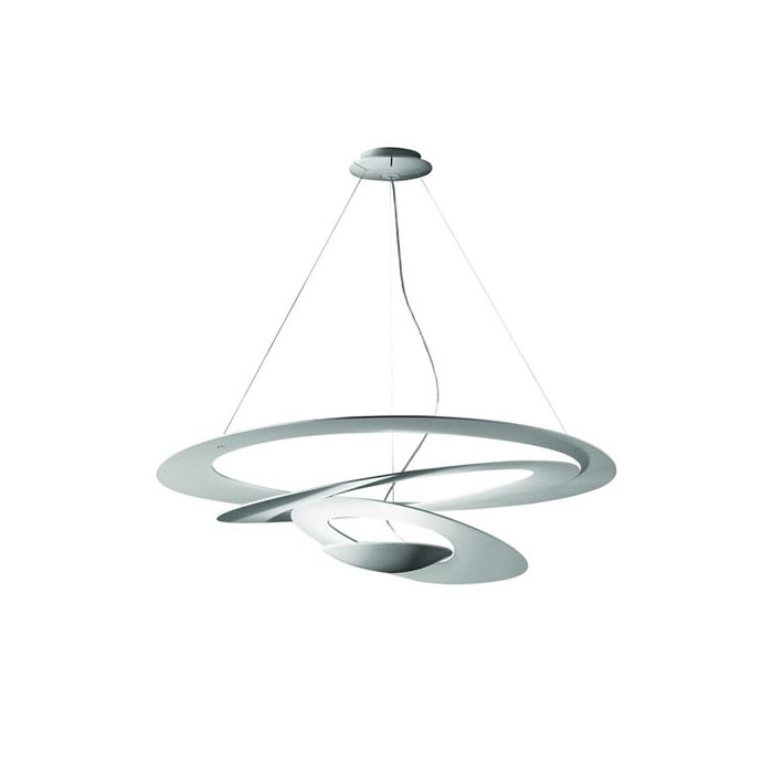 La suspension Pirce LED se compose de spirales découpées dans un grand disque d'aluminium verni blanc. La source LED est située sur la coupole du bas. La lumière, dirigée vers le haut, rebondit sur les spirales réfléchissantes. Ce ruban lumineux joue avec les ombres pour un effet magique... Cette suspension aux dimensions imposantes habille les grands volumes de sa présence aérienne et graphique. Un disque mince donne naissance à des volutes flottantes qui retombent doucement vers le bas en créant des effets magiques de forme et de lumière. Sublimez votre intérieur grâce à Pirce !