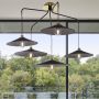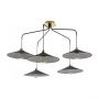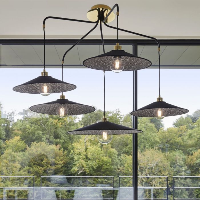 Plafonnier 5 lumières en métal peint finition sablée et détails laiton. Composé de 5 bras articulés et caches douilles en métal. Equipé de cordelières textiles et d'un pavillon en métal peint adaptable DCL et de 5 abat-jour forme conique en tissus ou velours.