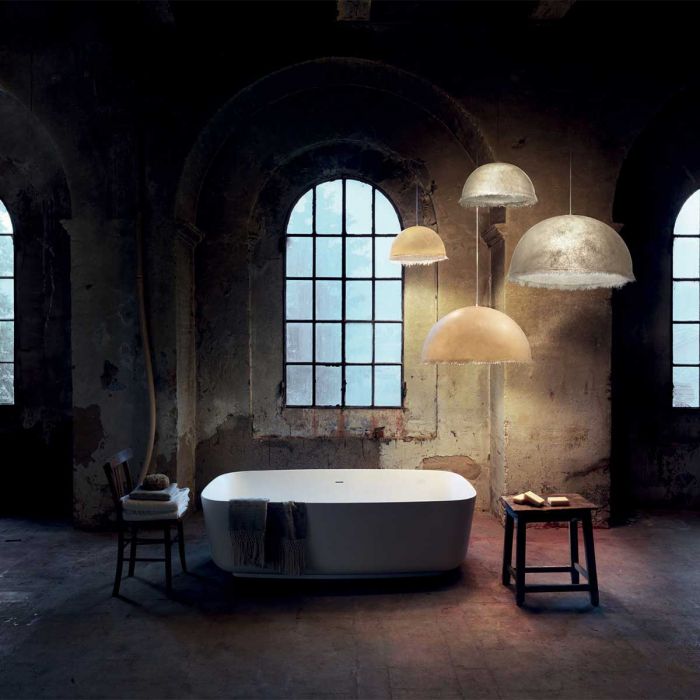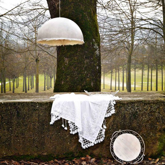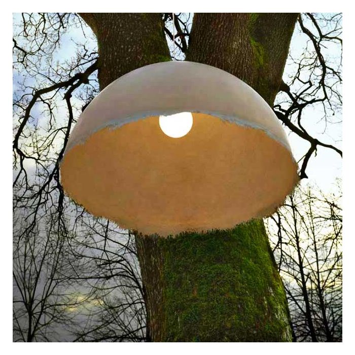 Tout comme les micro-organismes prélevés dans les courants marins, suspendus dans l'air, portés par l'imagination, voici la suspension Plancton de Karma, une demi-sphère en fibre de verre peinte en blanc avec les bordures non finies, adaptée pour l'extérieur.