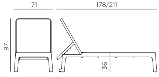 Plano de Nardi. Bain de soleil aux lignes épurées et harmonieuses, associées à une grande surface d’appui accueillante. Le dossier peut être réglé en quatre positions jusqu’à ce qu’il soit complètement plat.