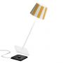 Poldina Lido de Zafferano. Poldina Lido , une édition spéciale qui allie la praticité contemporaine des lampes sans fil avec la valeur de la tradition manufacturière italienne. Poldina Lido se caractérise par un couvercle de l'abat-jour en céramique blanche, fabriqué à la main dans une usine historique de Civita Castellana, un village de la région de Viterbe où cet art ancien est attesté depuis le Xe siècle avant JC. Le couvercle est peint à la main, dans différentes variantes rappelant les cabines d'un établissement balnéaire. Les fonctions de ce modèle sont les mêmes que celles de Poldina : lumière LED dimmable, commandes tactiles, base de chargement par contact et indice de protection IP65 qui le rend également utilisable à l'extérieur.