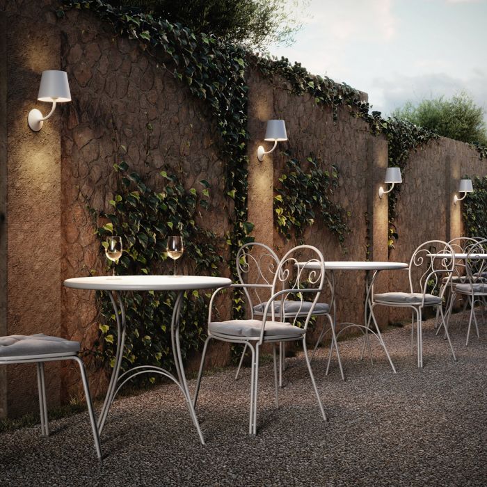 Applique avec structure en aluminium moulé sous pression peint et diffuseur en polycarbonate transparent. La source lumineuse est à LED (ampoule E27 non incluse). Les versions LED sont dimmables. Le haut degré de protection (IP54) des appliques murales rend le produit adapté à une utilisation intérieure et extérieure.