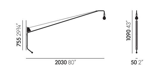 La lampe murale Potence est l'un des chefs-d’œuvre puriste de Jean Prouvé. Réduite à l'essentiel - une ampoule et une attache murale pivotante - la lampe à long bras oscillant est réalisée en acier tubulaire à la finition époxy et comporte une poignée en chêne. La lampe est commandée par un cordon variateur et est équipée d'une ampoule.