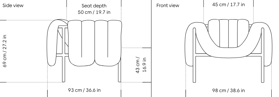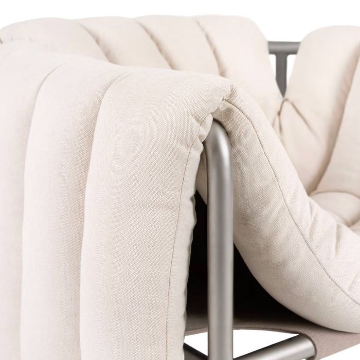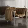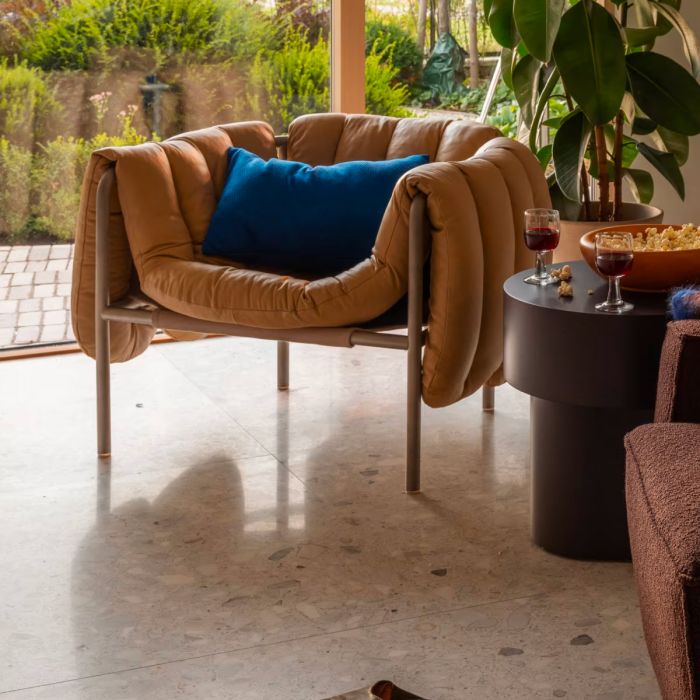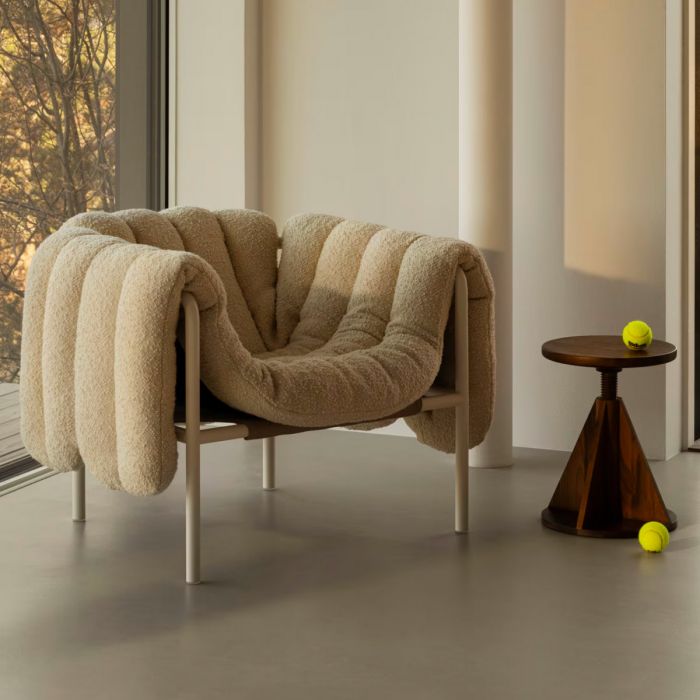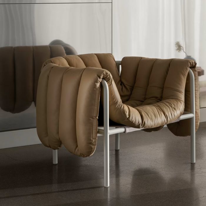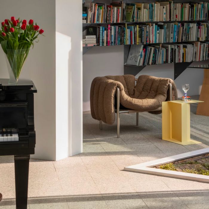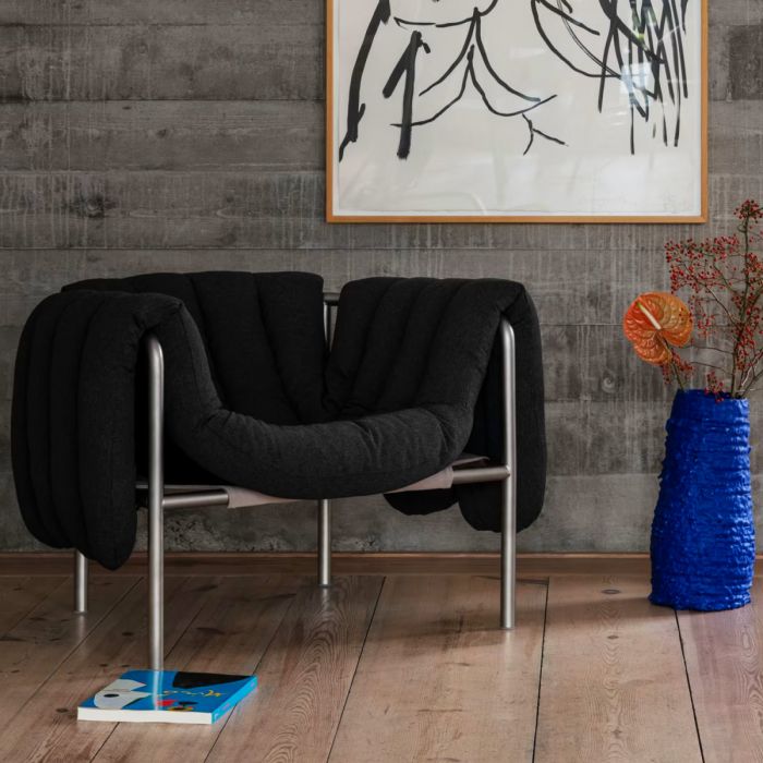 Puffy de Hem par Faye Toogood. Le revêtement amovible de la chaise longue Puffy est gras et dodu, sa forme généreuse se répand librement sur les côtés d'un cadre en acier tubulaire qui, en contraste frappant, est aux lignes dures et solides. Les deux éléments clés de ce design de siège de Faye Toogood se juxtaposent de manière ciblée et ludique. Le cadre élémentaire s'inspire de la structure rationnelle du design moderniste classique, tandis que le revêtement extravagant semblable à une courtepointe enveloppe et enveloppe chaleureusement, est réconfortant et rassurant.