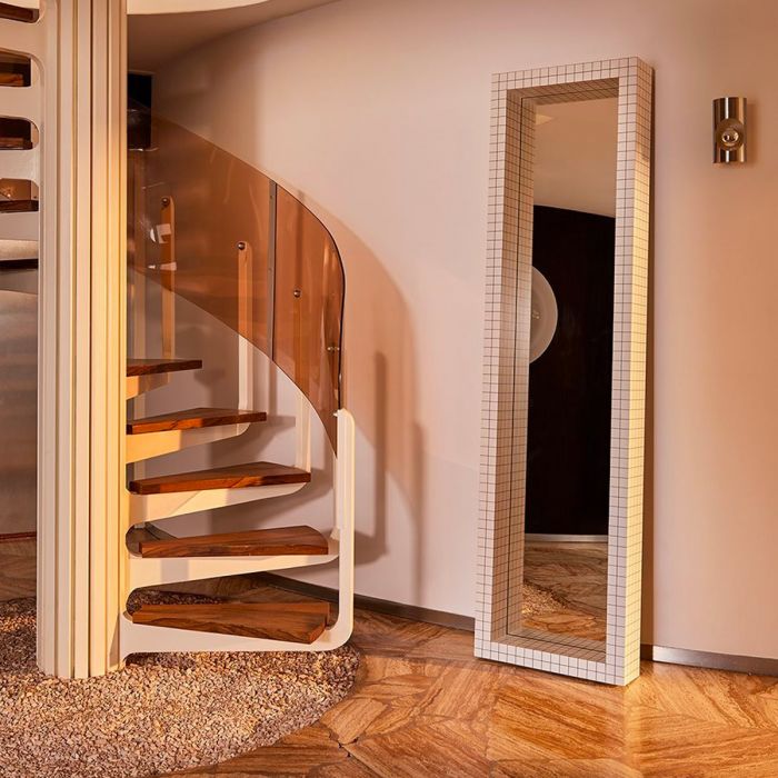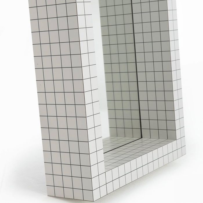 Le Quaderna Mirror s'inspire du module de sculpture "Measuring Mirror" que les architectes du groupe ont utilisé pour étudier l'effet de la super surface continue et potentiellement infinie. Une plaque de verre de 5 mm d'épaisseur est contenue périmétriquement par un cadre de 51x15x195 cm en bois stratifié blanc Print, imprimé numériquement avec des carrés noirs à 3 cm d'espacement. Le miroir est posé au sol et fixé au mur.