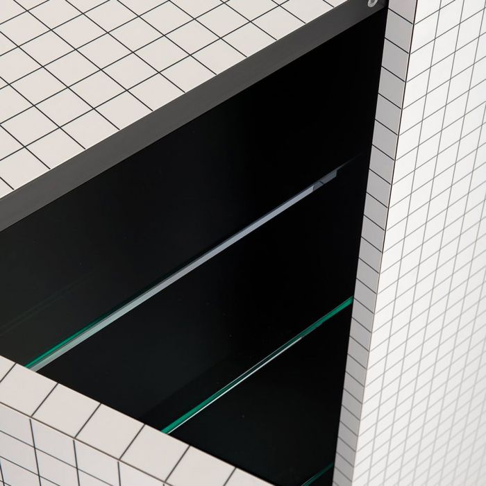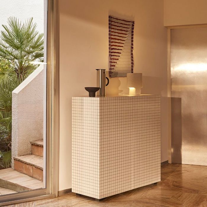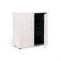 L'armoire Quaderna est un meuble de service pour la salle à manger. Il a une structure en bois stratifié Print blanc, imprimé numériquement avec des carrés noirs avec un espacement de 3 cm. L'armoire a 2 portes battantes. Placage interne en stratifié noir. Étagères intérieures orientables en verre trempé épaisseur 10 mm. Dimensions : 102x42x105 cm.