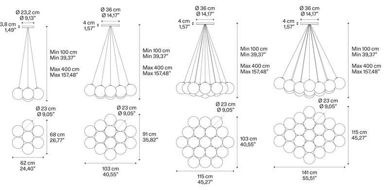 Random Cloud saisit l’essence de la raison pour laquelle les nuages ne cessent de nous fasciner : volumineux, légers et fluctuants à la fois. Random Cloud redécouvre le concept de lustre dans une touche contemporaine et enrichit la collection en termes de fonctionnalité. Les multiples compositions et configurations au choix des utilisateurs font de Random Cloud une option polyvalente pour les environnements domestiques, hôteliers et de bureau. Random Cloud n’a pas seulement été créé comme un élément décoratif et percutant, mais est aussi un lustre hautement fonctionnel et performant avec une émission lumineuse atteignant 11040 lumen. Chaque option de composition peut être obtenue avec des sphères de 23 ou 28 cm de diamètre, en choisissant l’une des sept finitions disponibles, offrant ainsi différentes solutions décoratives pouvant s’adapter à n’importe quel contexte ou style.